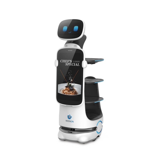 El KEENON T10LS es un elegante robot de servicio autónomo para meseros que optimiza el servicio al transportar hasta 10 kg por bandeja con eficiencia y estilo, gracias a su diseño de 4 niveles y una estructura robusta de ABS y aluminio que permite adaptarse a diferentes entornos como restaurantes, cafeterías, hospitales o salones de eventos Equipado con navegación inteligente SLAM basada en LiDAR, visión estéreo y VSLAM, se mueve de forma segura por pasillos estrechos (mínimo 58 cm), evita obstáculos en tiempo real y planifica rutas precisas Con una autonomía de 6 a 8 horas, velocidad ajustable hasta 1 m/s, y carga rápida en solo 5 horas, este robot trabaja casi de continuo mejorando la eficiencia operativa Su operación silenciosa y visual es complementada con pantallas de interacción (11.6″ para control y 23.8″ para publicidad), además de guías luminosas y mensajes de voz que elevan la experiencia del cliente. Compacto (58 kg, 48×55×140 cm) y con capacidades multi-punto—puede atender hasta 20 mesas en una sola ruta—, el T10LS impulsa un servicio automatizado, fluido y atención más personalizada, sin necesidad de intervención constante del personal